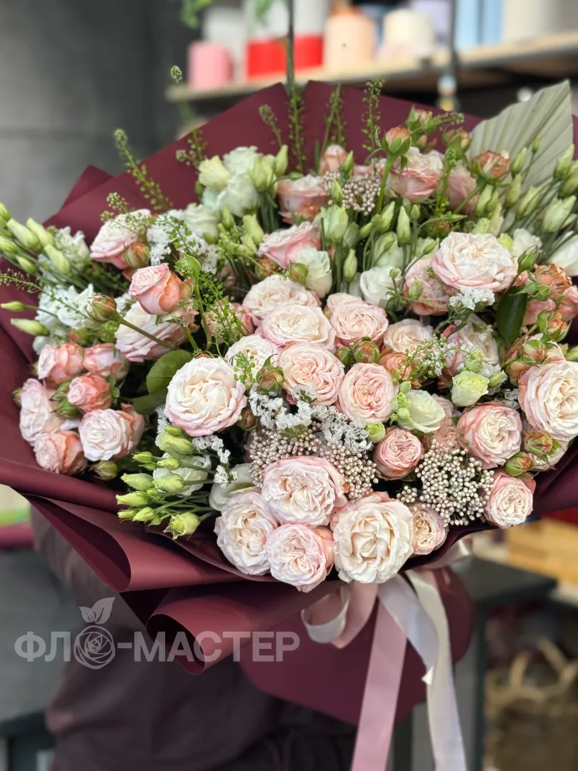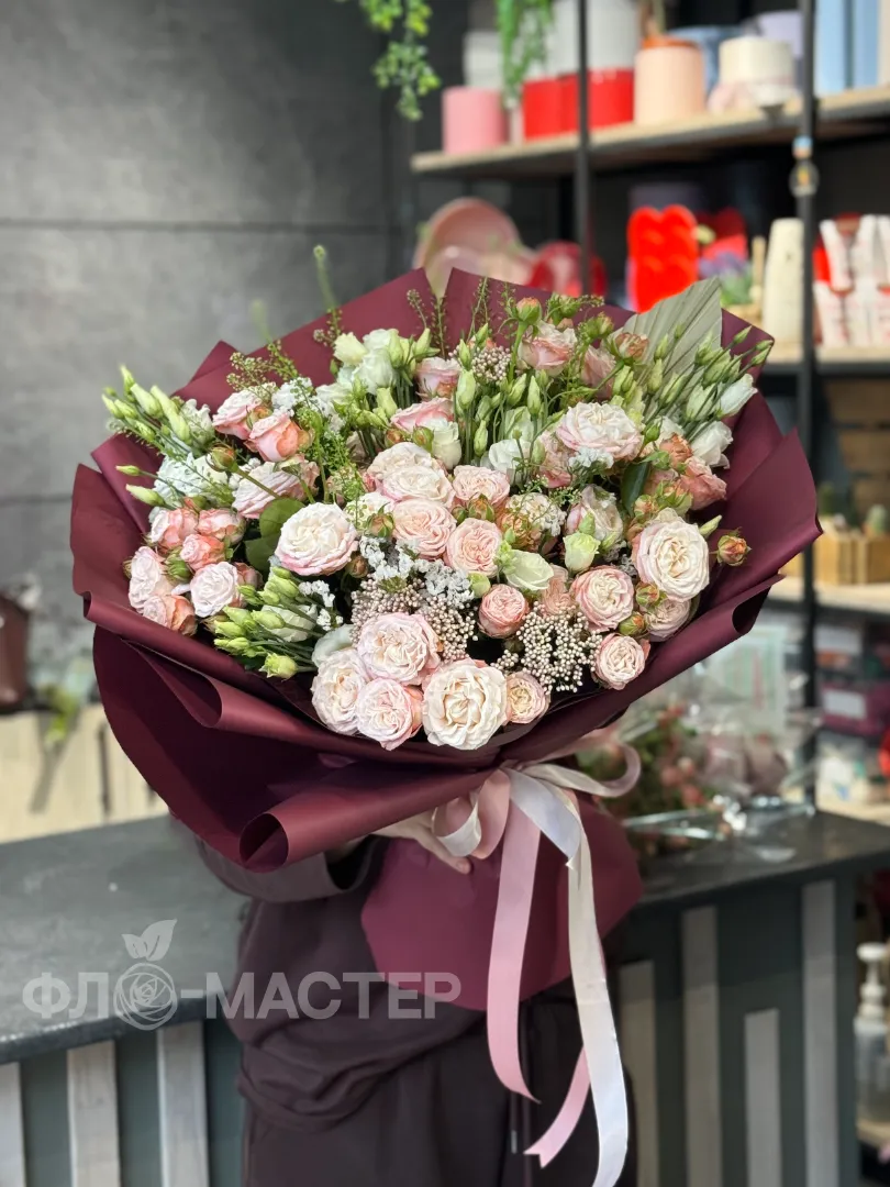 Погрузитесь в мир утонченной красоты с нашим великолепным букетом пионовидных кустовых роз, обрамлённых роскошной бардовой упаковкой. Не упустите шанс подарить самому близкому человеку мгновение счастья.
