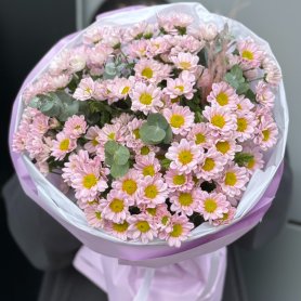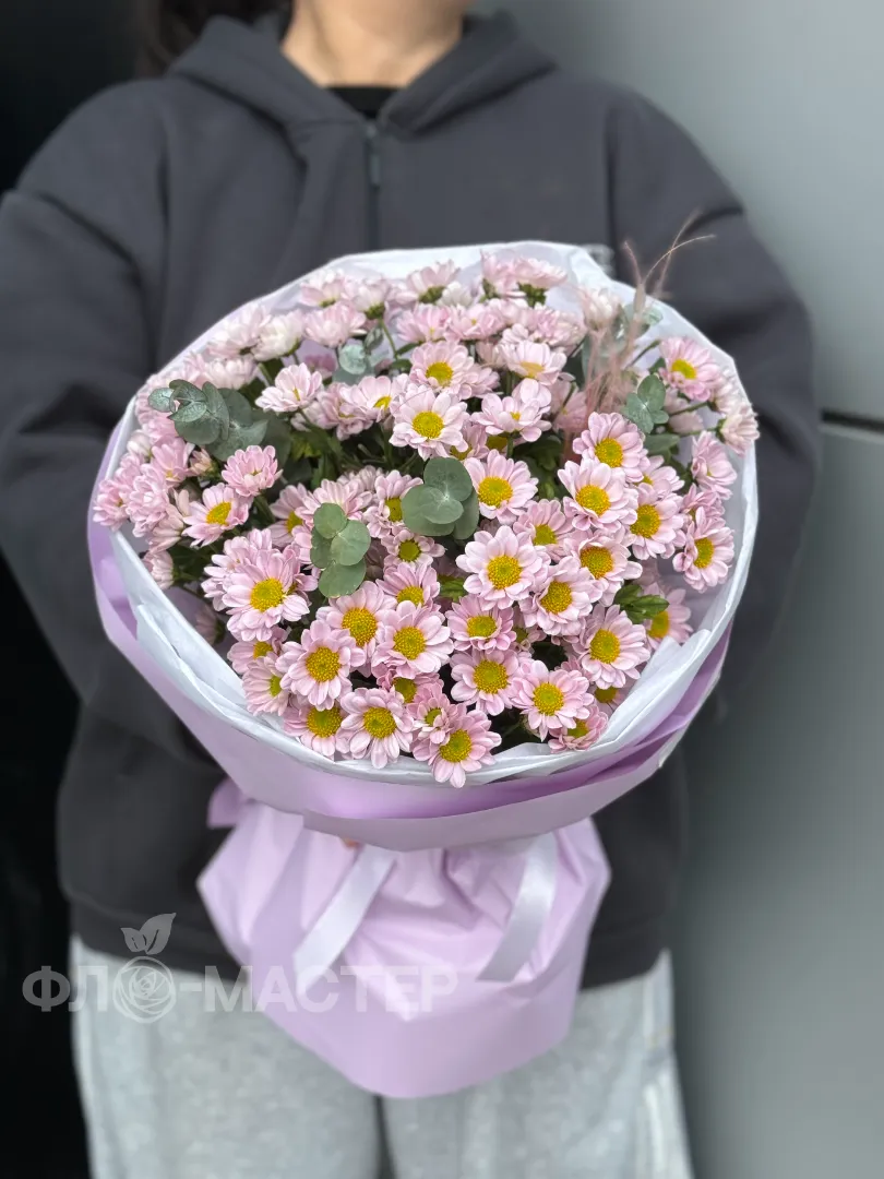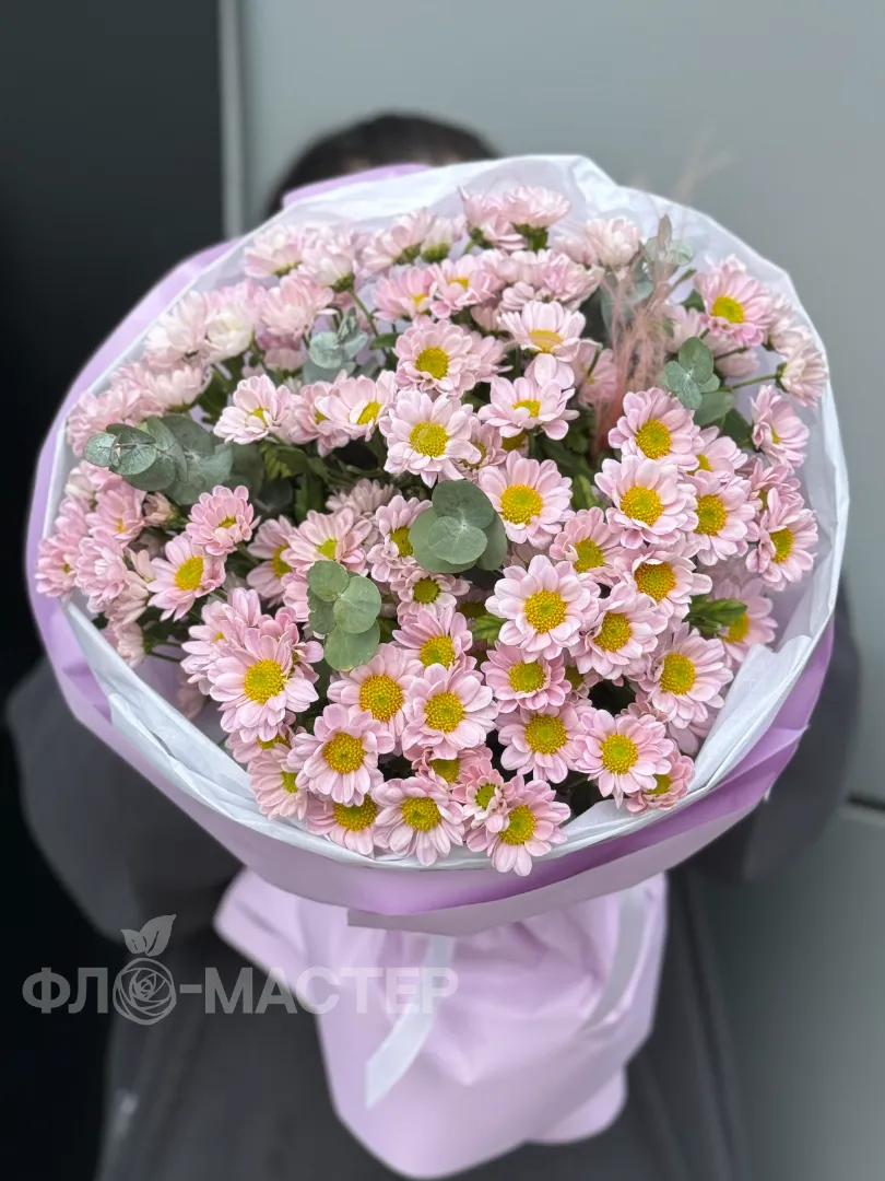 Нежные сантини в сочетании с эвкалиптов создают идеальную симфонию букета. Милые ромашки напомнят лето в любое время года.