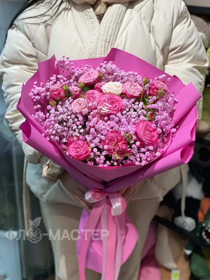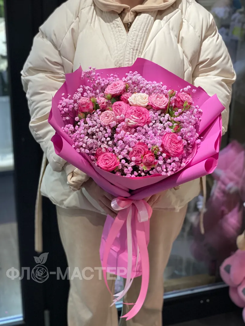 Букет в розовых оттенках с пионовидными кустовыми розами.
