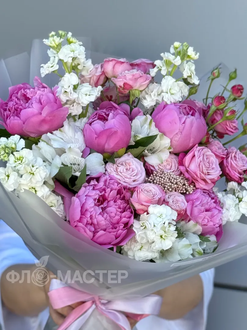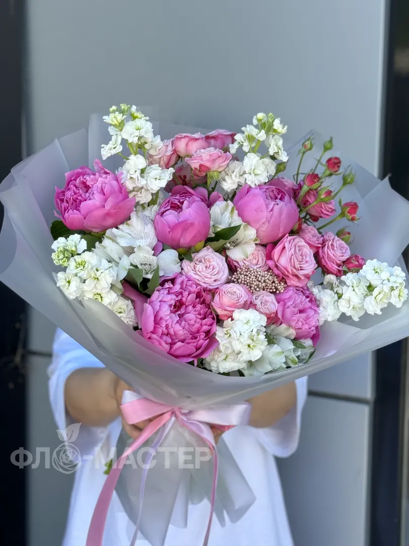 Погрузитесь в атмосферу истинной роскоши с этим изысканным букетом, в котором царит неподдельная нежность и утонченность. Великолепные пионы, словно шедевры высокой моды, раскрываются мягкими лепестками, окутывая пространство ароматом элегантности и благородства. Этот букет — символ безупречного вкуса и статуса, созданный для тех, кто ценит исключительность и хочет подчеркнуть свою уникальность.