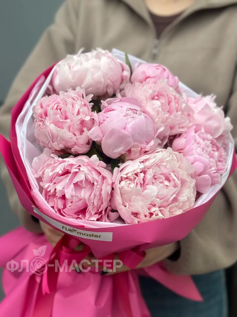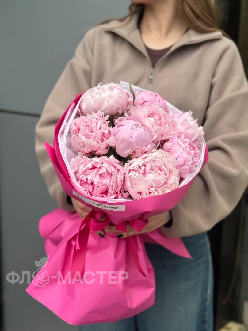 Милый букет из девяти пионов, оформлен в яркую упаковку, которая подчеркивает красоту пионов.