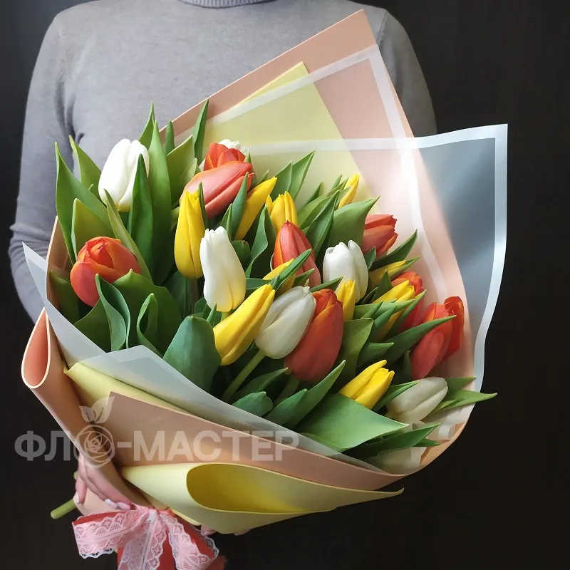 Весенние настроение к букету идет в подарок. Цвет тюльпанов может отличаться в зависимости от наличия в магазине.