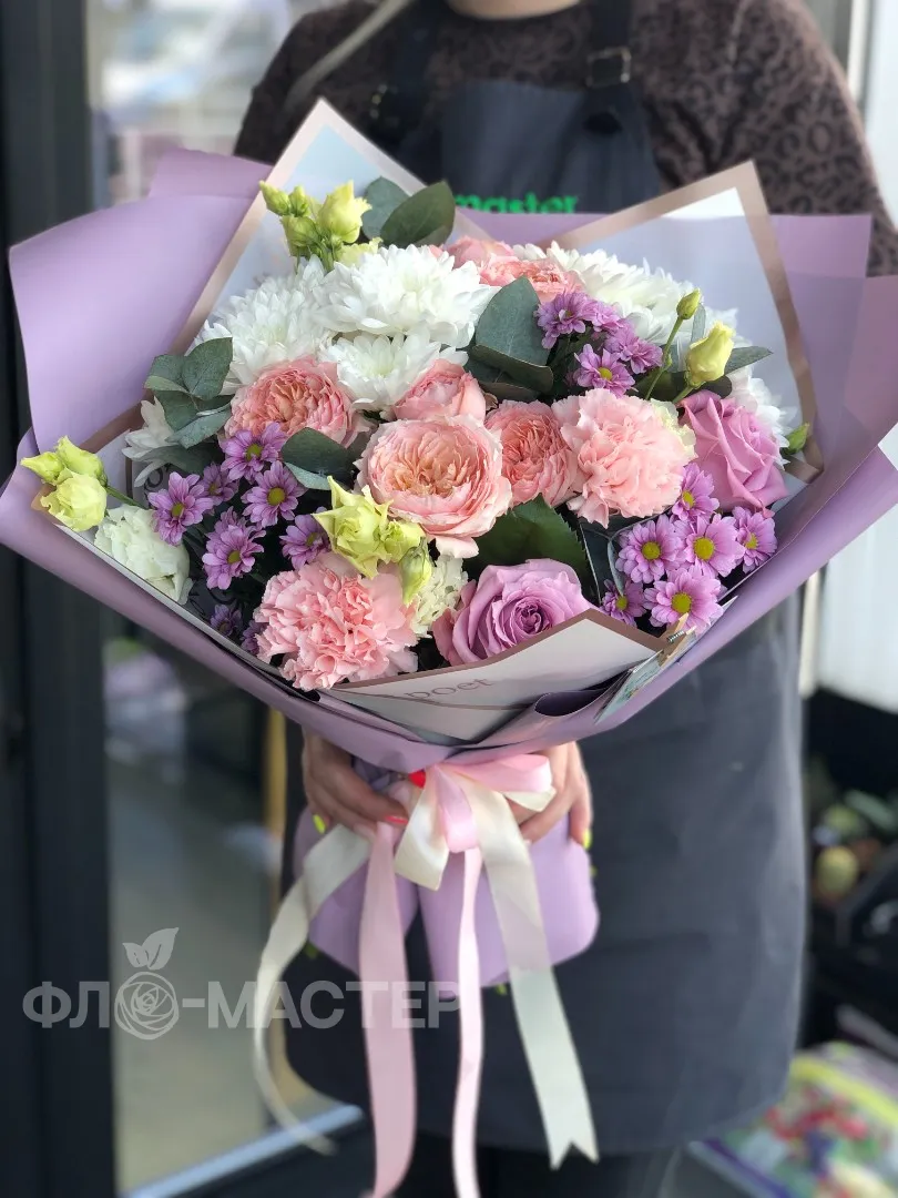 Чудесный букет с кустовыми розами и диантусами будет долго радовать получателя