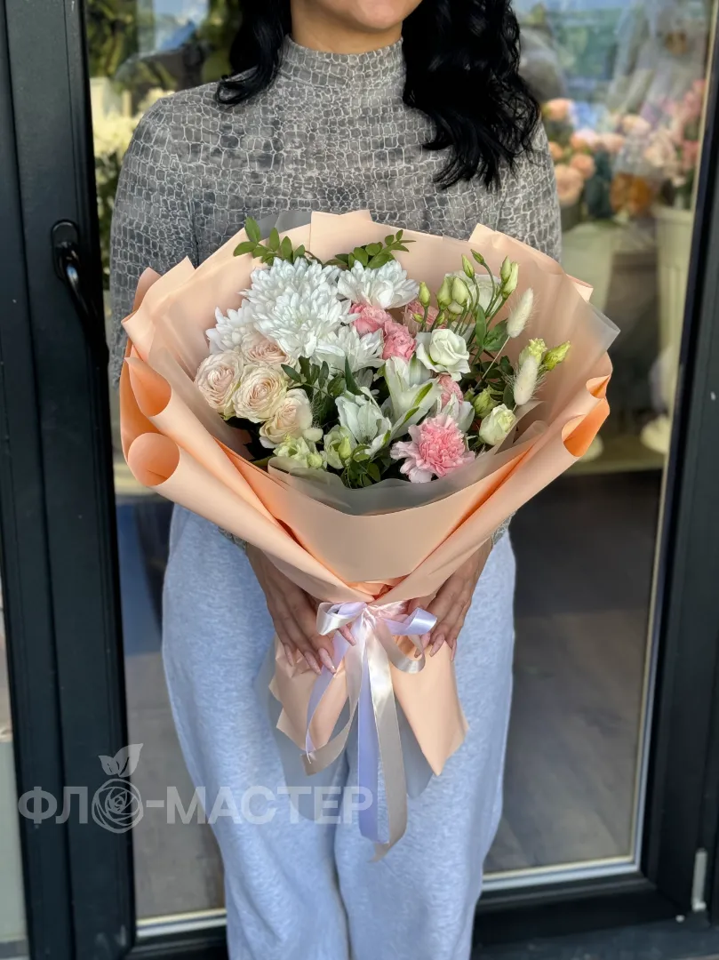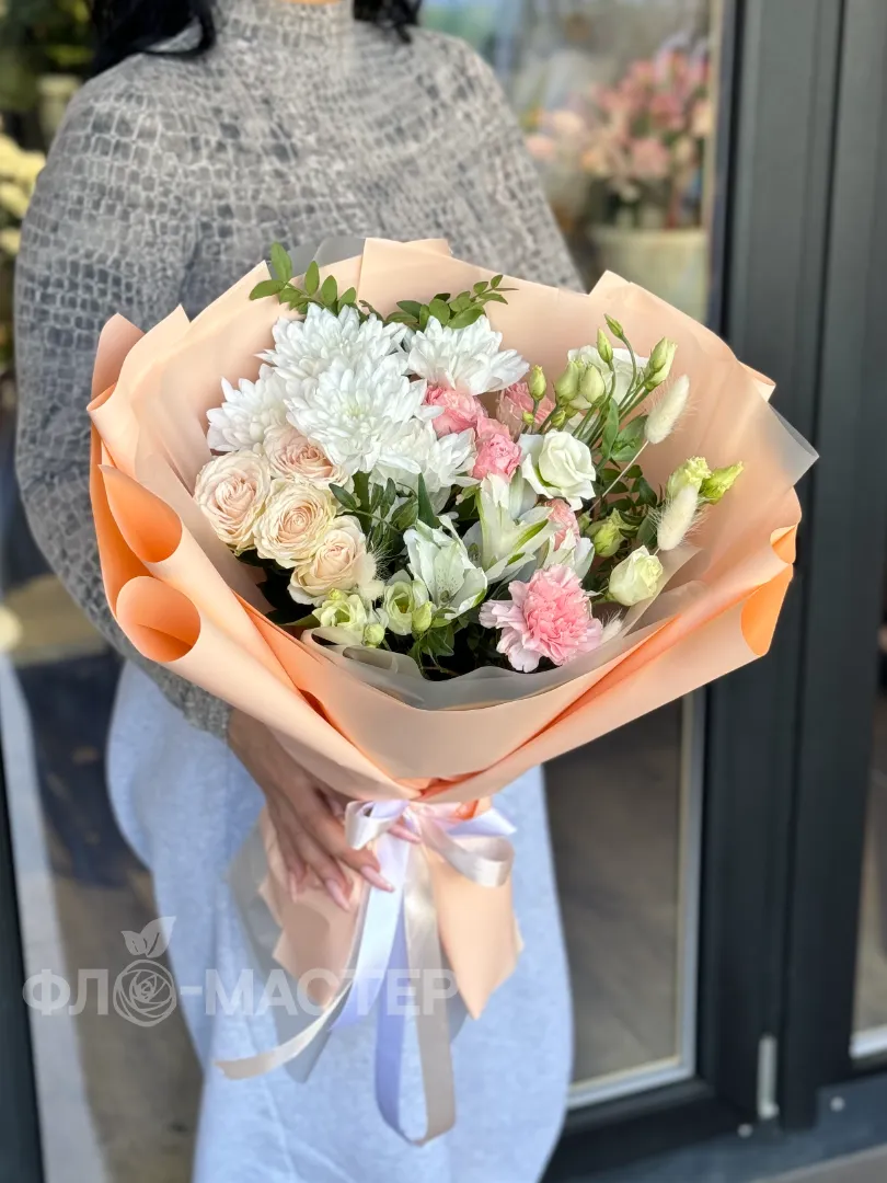 Сборный букет в персиковых оттенках будет долго радовать получателя и дарить прекрасное настроение.