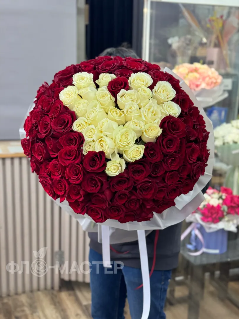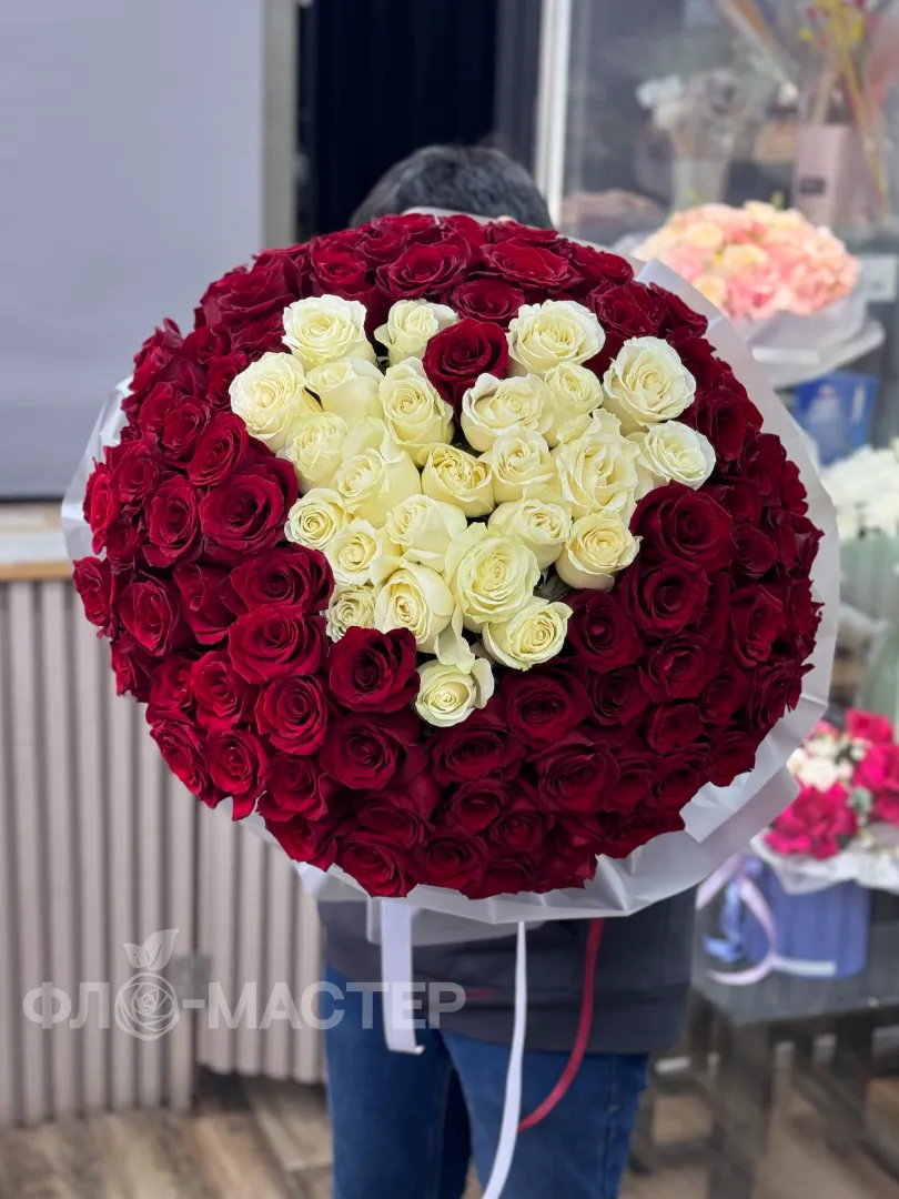 В центре композиции расположено сердце, сформированное из 25 белых роз, которые олицетворяют чистоту и искренность чувств. Это контрастное сочетание цветов создает эффектный визуальный акцент, привлекая внимание и вызывая восхищение.