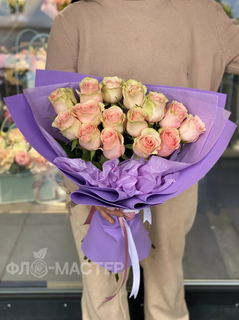 15 эквадорских роз сорта «Frutetto» в красивой фиолетовой упаковке из фоамирана.