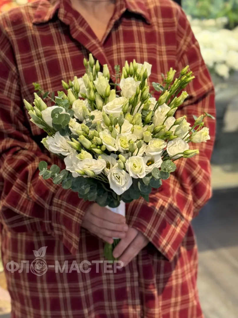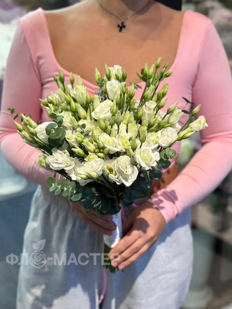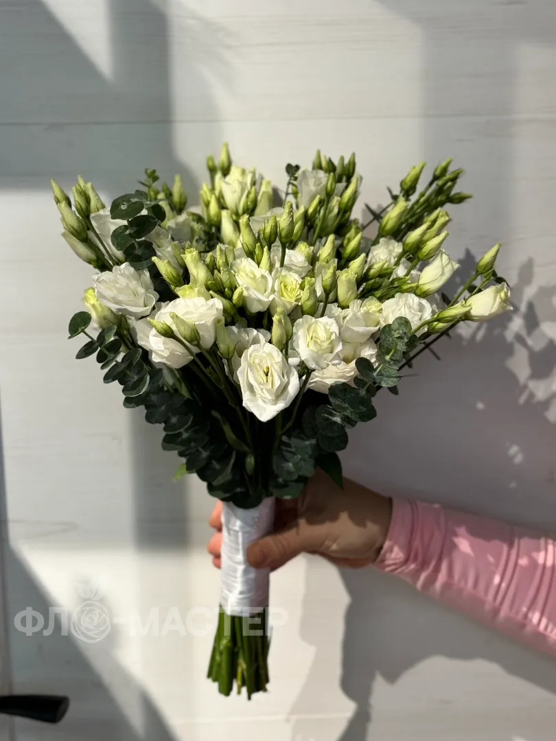 Классический букет с эустомой подойдет к каждому платью невесты.