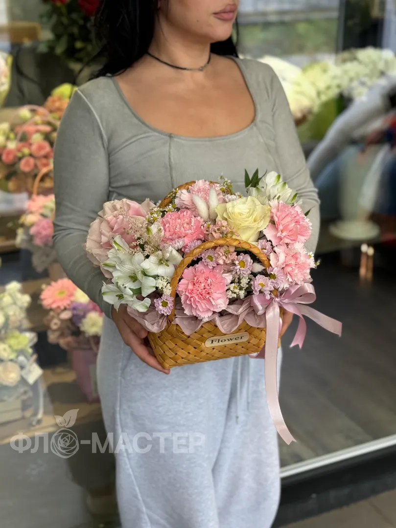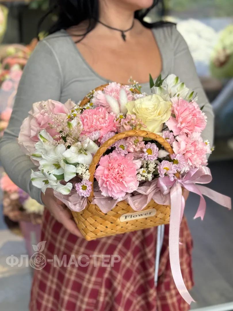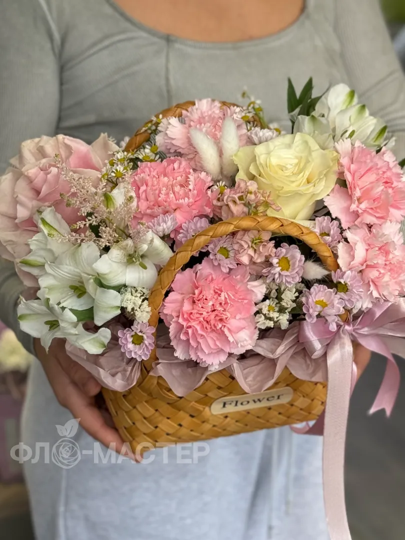 Восхитительная композиция цветов, утопающая в нежных оттенках розового, поистине завораживает своим великолепием. Каждый элемент в корзине, словно капля росы на утреннем солнце, создает единую симфонию цвета и формы.