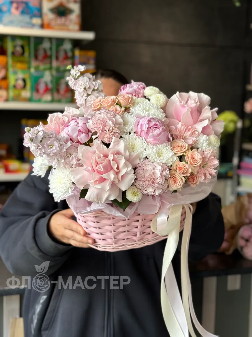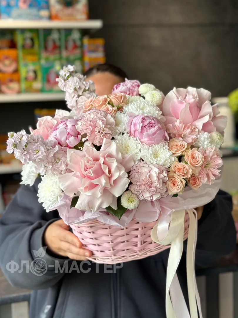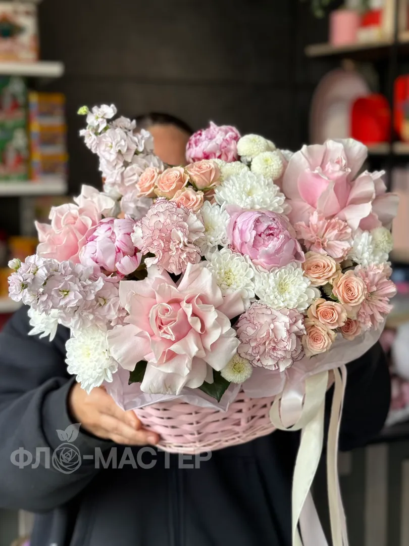 Царская корзина в нежных оттенках для любимой принцессы. Красивые Французкие розы идеально сочетаются с пионами.