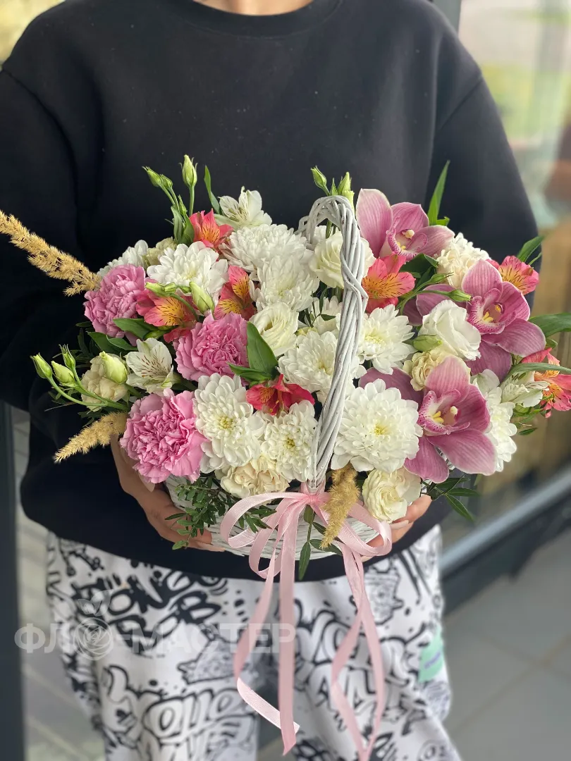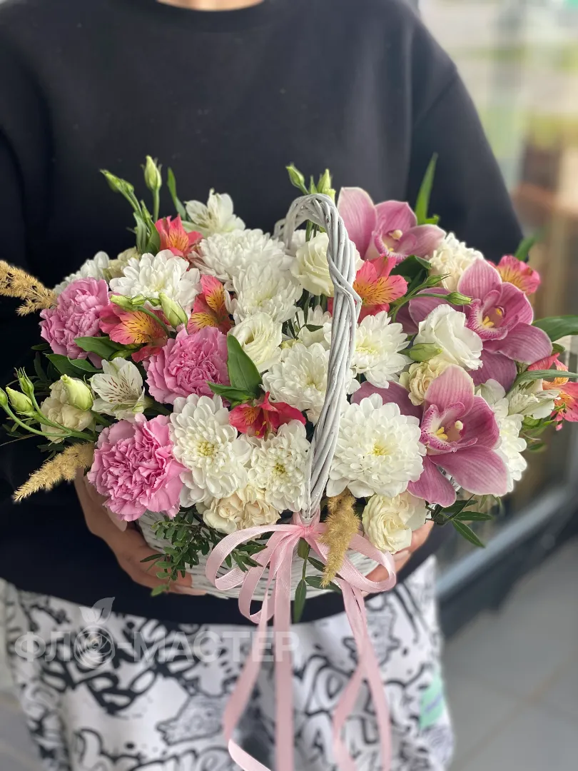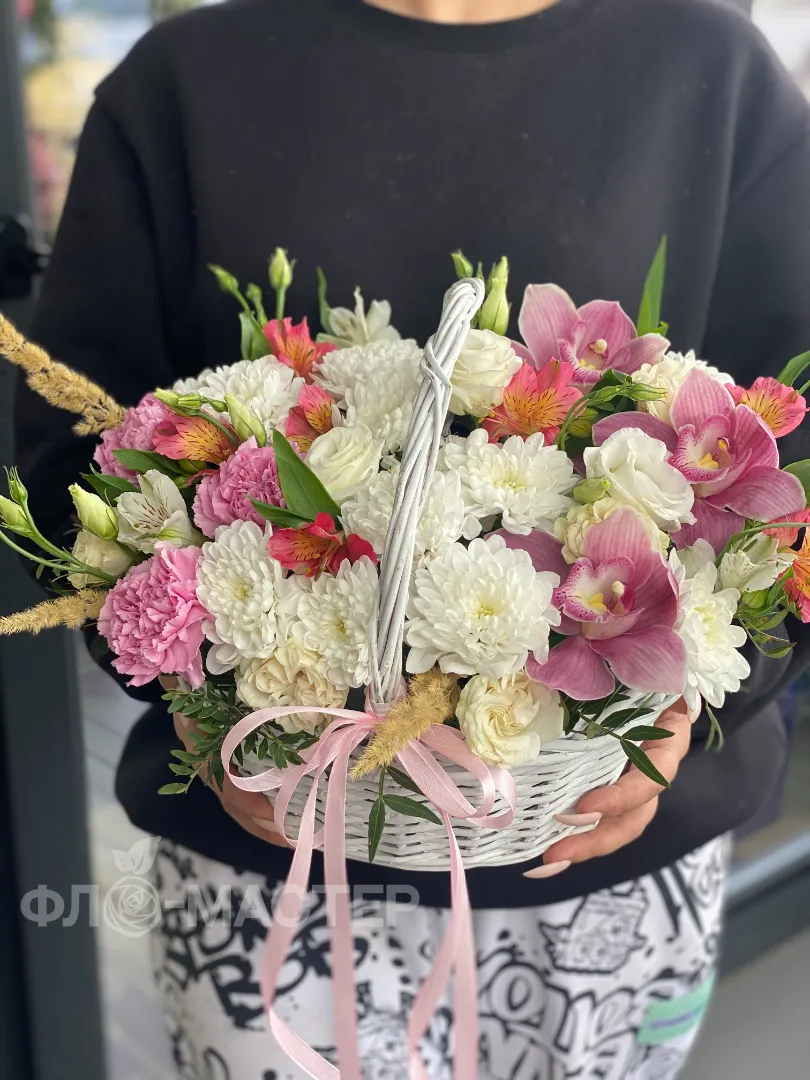 Милая корзинка с хризантемой и орхидеями будет долго радовать вашу любимую своей красотой.