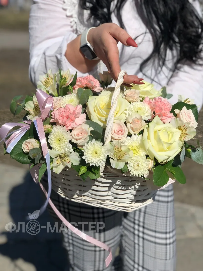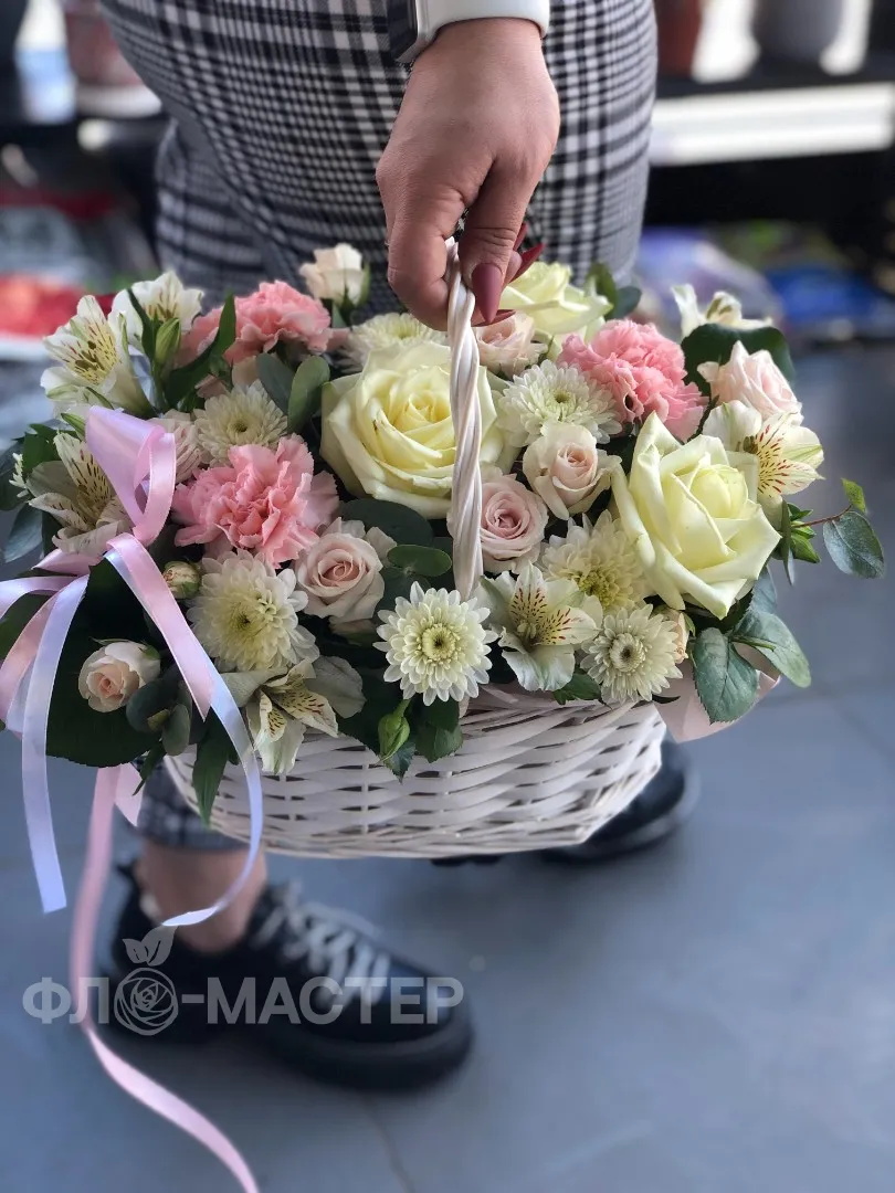 Стильная корзинка с цветами в белых оттенках, каждая девушка будет счастлива получить такую красоту.