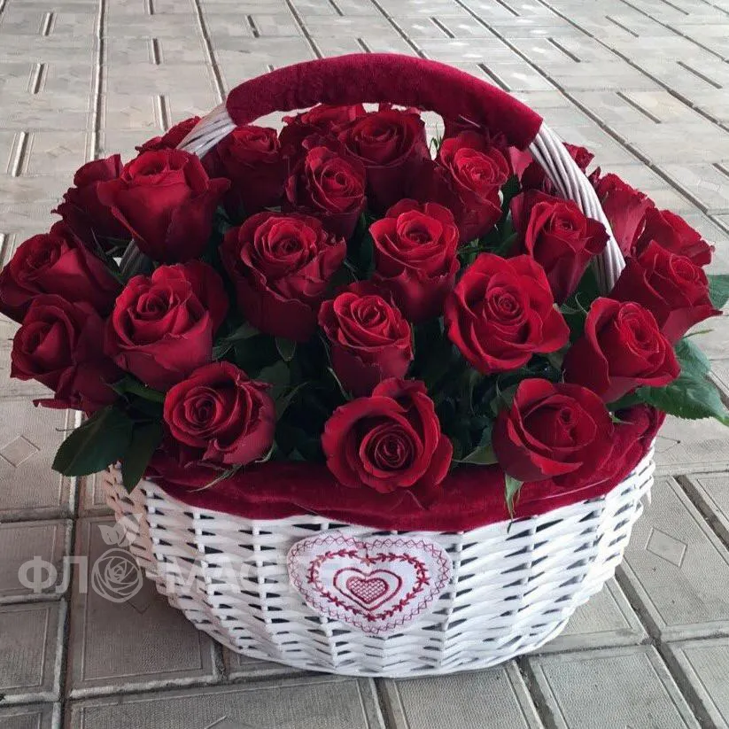 35 эквадорских красных роз собранные в плетеную корзинку будут прекрасным подарком на любое торжество.