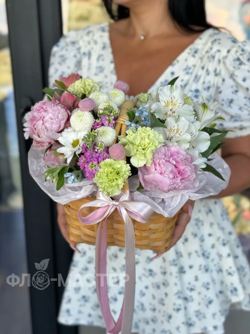 Корзина с большим разнообразием цветов, которые подчеркивают шикарные пионы. Успей порадовать свою любимую, пока сезон пионов не закончился.