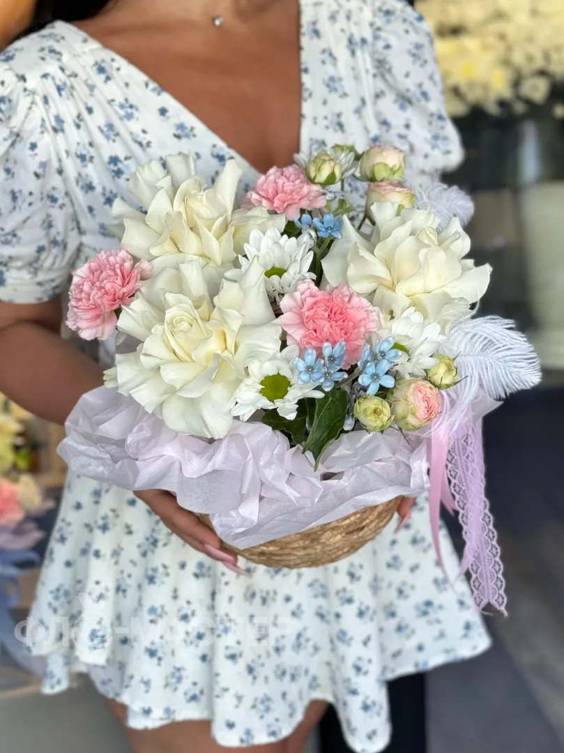 Нежнейшая композиция цветов в плетеной корзине. Большие ажурные розы в сочетании с голубым оксипеталумом создают волшебство, этой красотой невозможно налюбоваться.