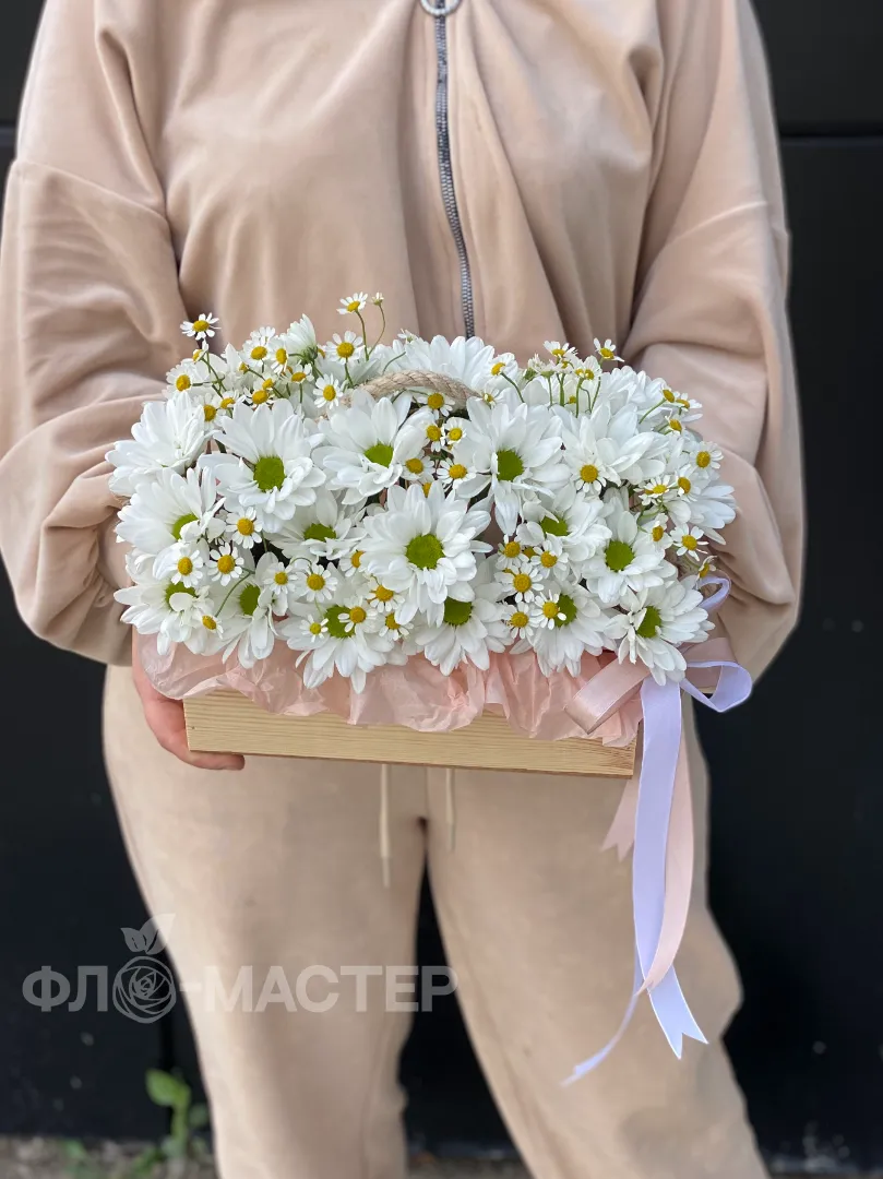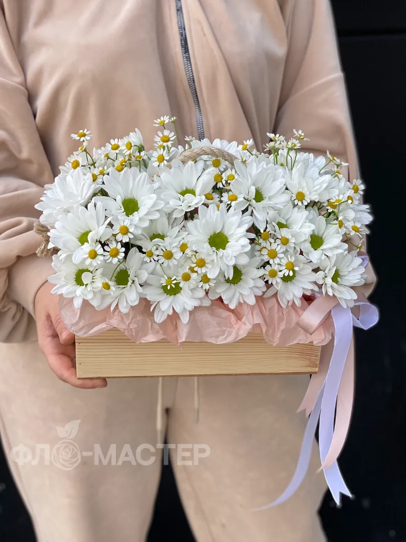 Полевая композиция с хризантемой и мелкой ромашкой в деревянном кашпо, отличный подарок женщине, жене, маме или коллеге.