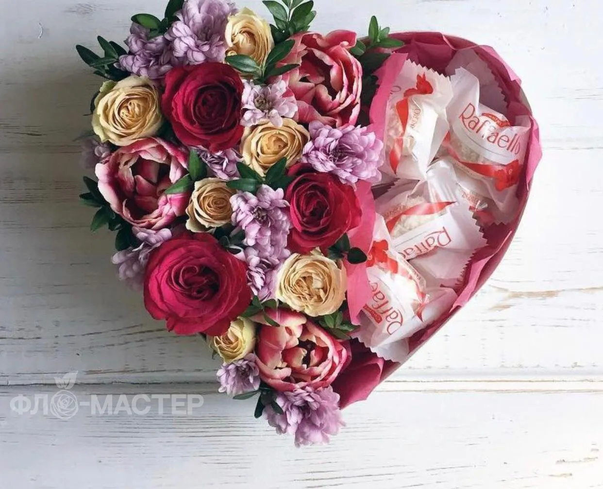 Коробка сердечко с цветами и конфетами Raffaello расскажет о ваших нежных чувствах получателю.