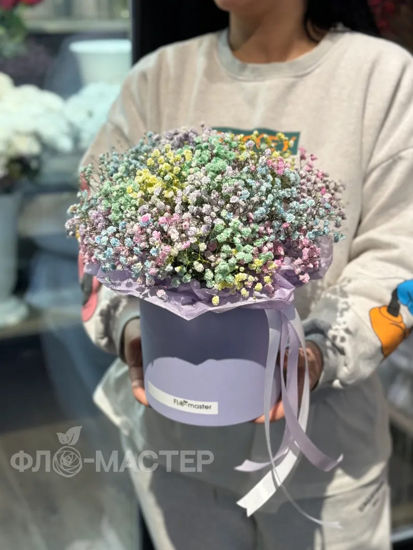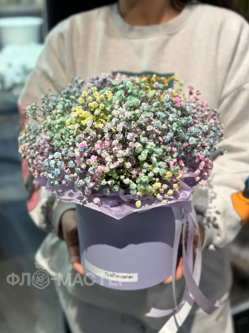Эта волшебная коробка, наполненная разноцветной гипсофилой, которая создает атмосферу радости и легкости. Каждый цветок в этой удивительной композиции излучает яркие оттенки, словно отражая все самые светлые и счастливые моменты жизни.