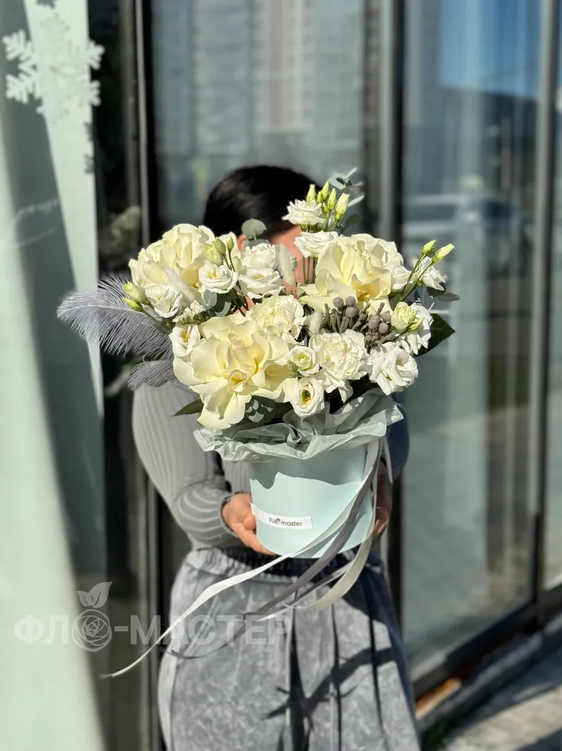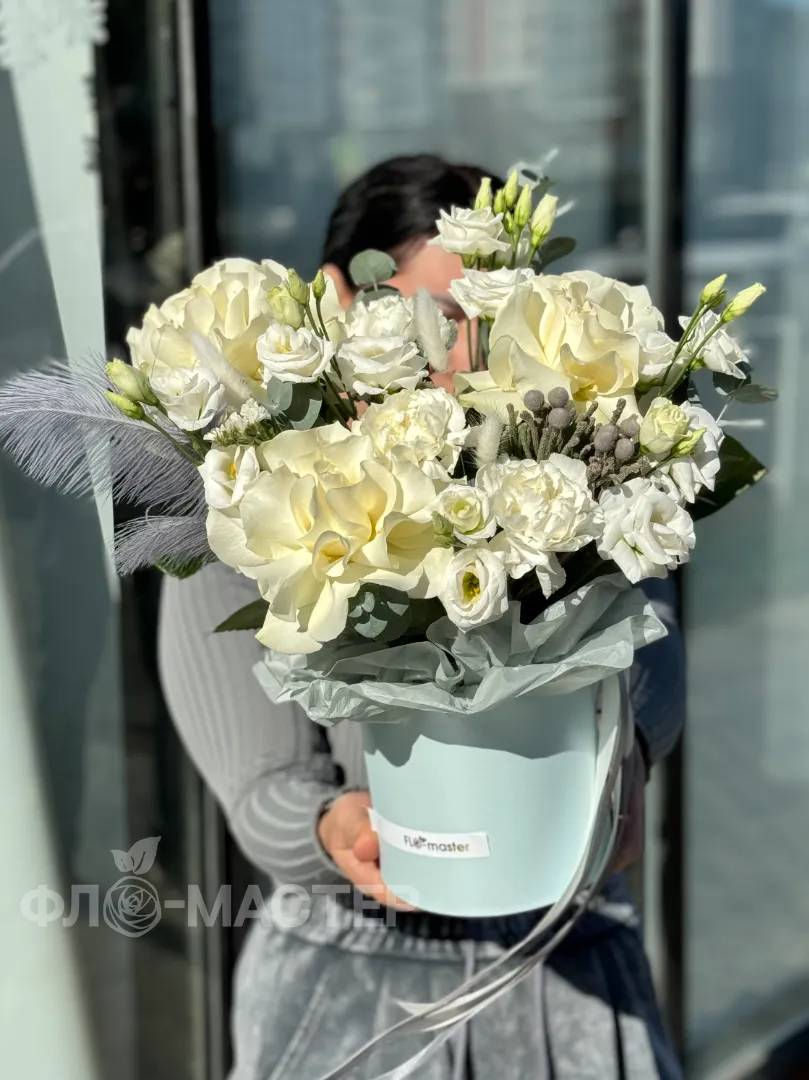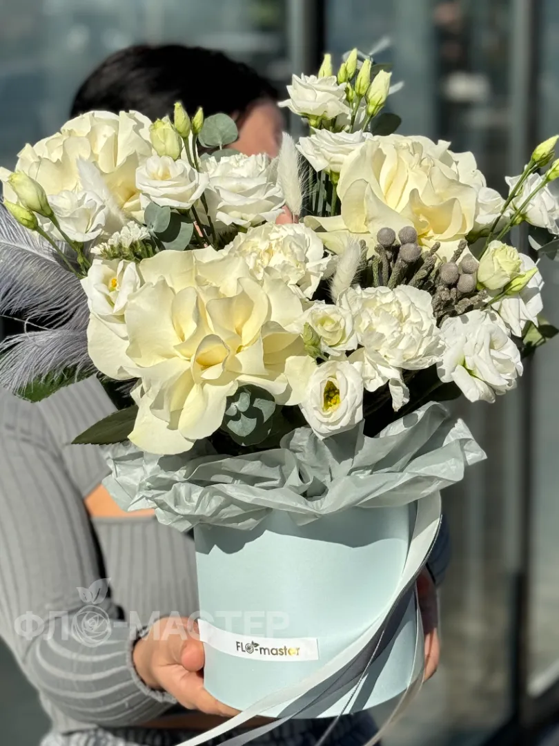Эустома с брасикой в голубой коробке дарит ощущение прогулки у моря, где-то на дальних островах.